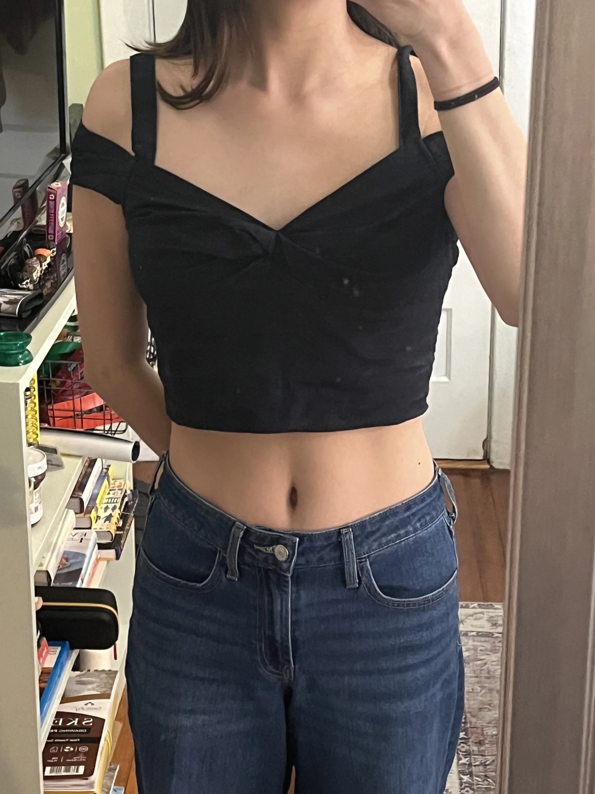 I was so excited to get this top because I love the off-the-shoulder look and this is a very romantic top. It was unfortunate that the top straps didn’t fit my shoulders even at their tightest. I’m glad I still had the chance to wear it! I liked this top with my wide-leg jeans to go out to dinner or a casual night on the town!
