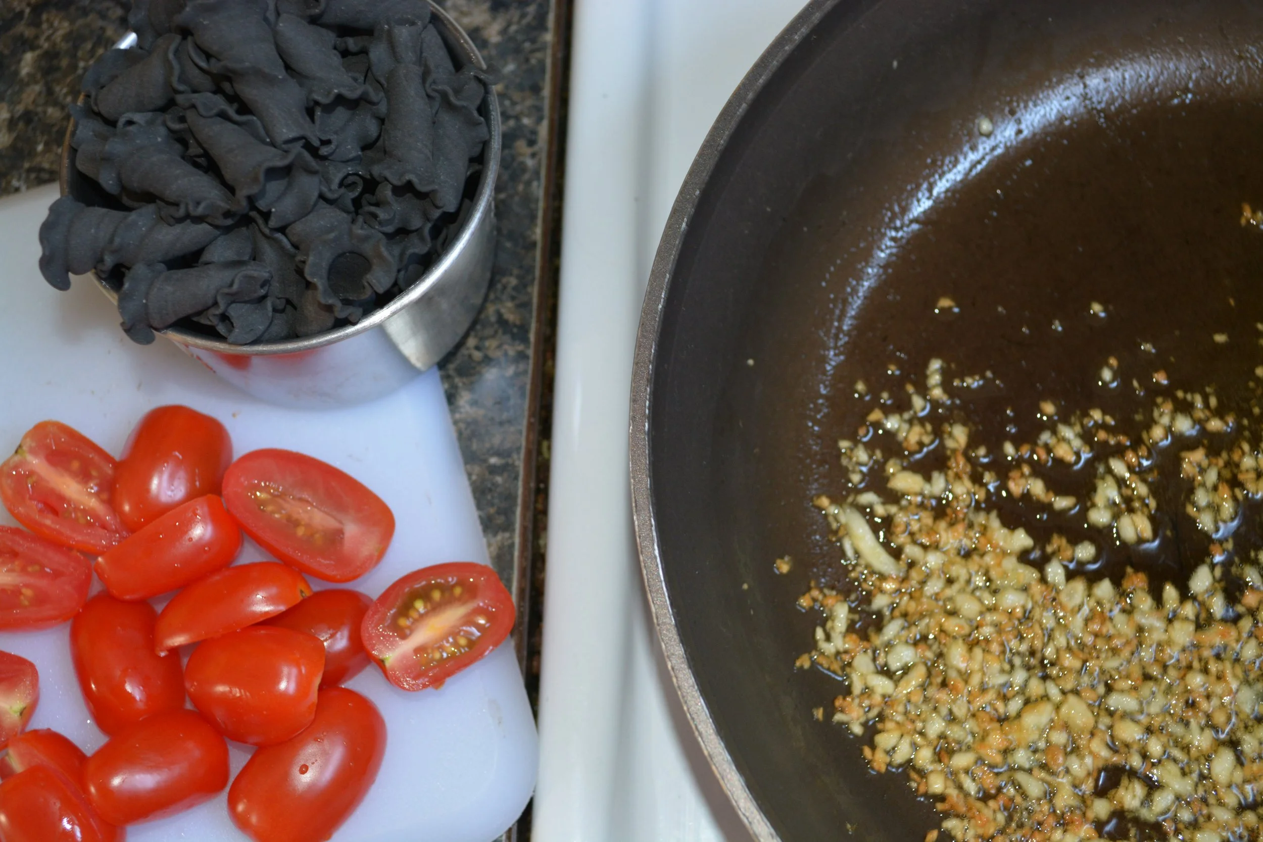 Squid Ink Campanelle with Cherry Tomatoes and Garlic